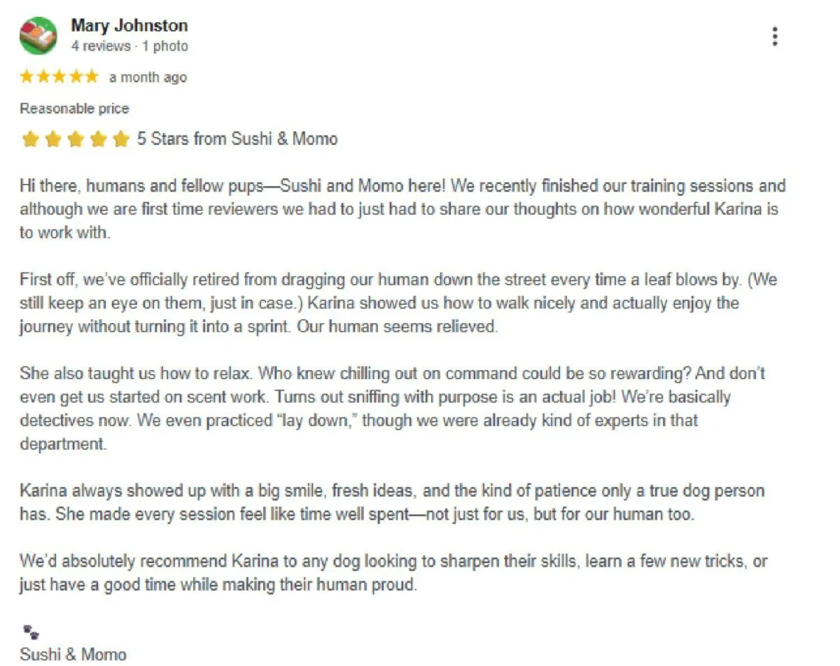🐾 Next-Step Training Recommendations If we’re the right fit, you’ll know exactly what comes next to turn your dog into the well-behaved pet you’ve always wanted.